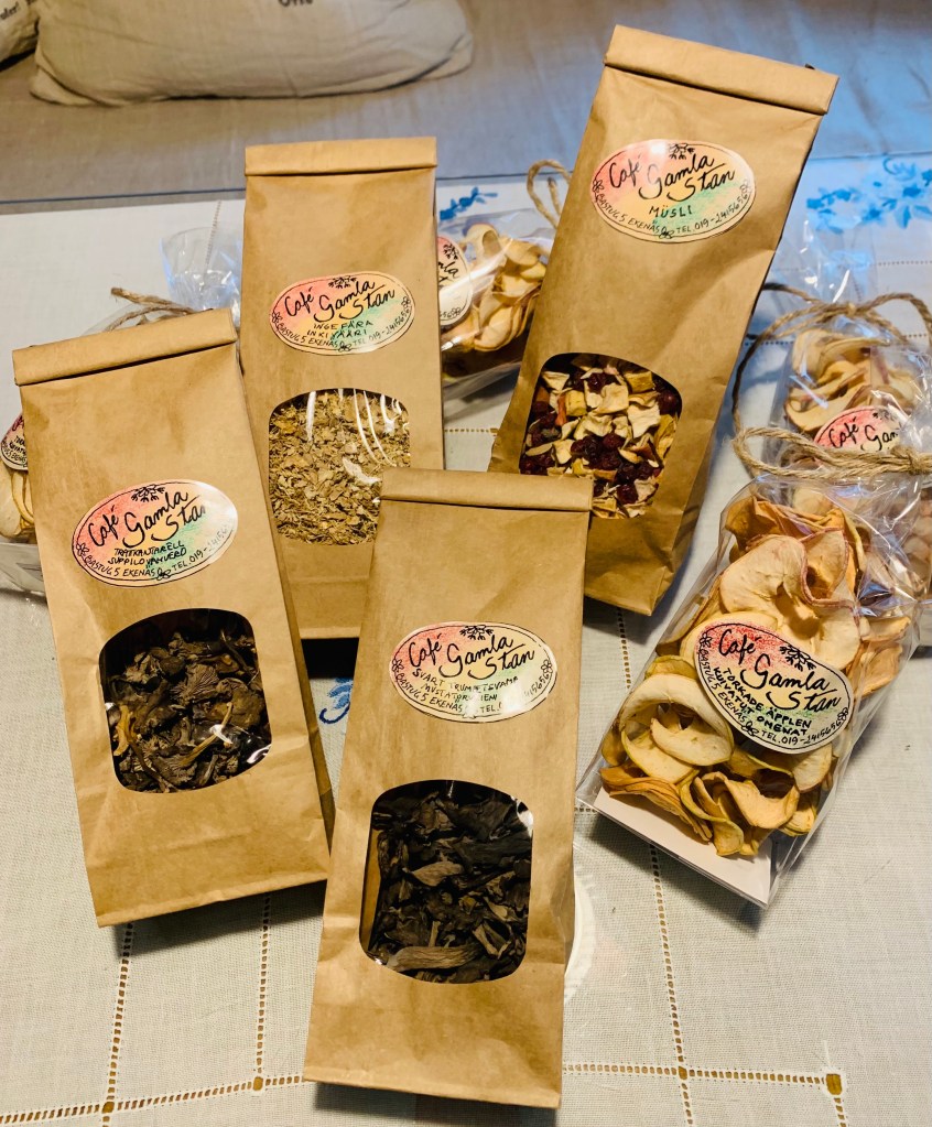 Torkades produkter; äppelchips, trattkantarell, ingefära, svart turmpetsvamp, mysli.