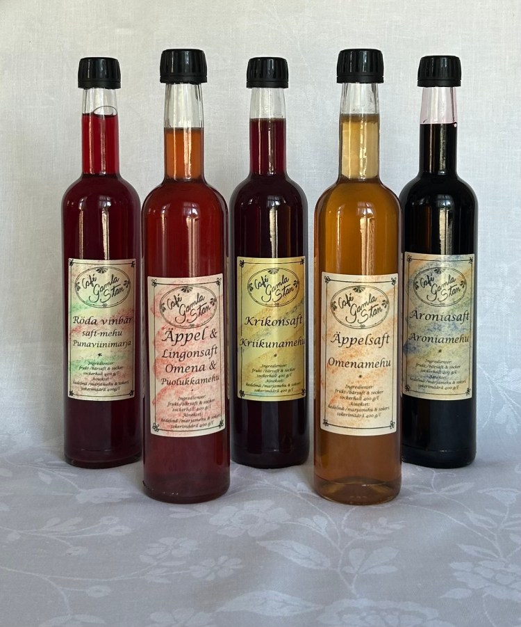 Blandsaft på flaska; Aronia, äpple, jordgubb – hallon – blåbär, rödvinbär.