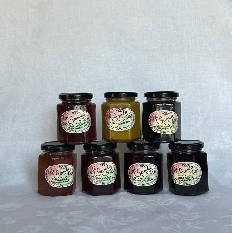 Geléer; Äppel, rödvinbär, aronia, körsbär, lingon och Bosses egen senap.